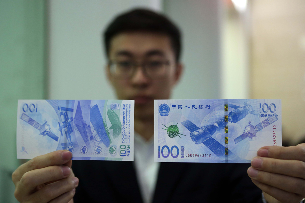 26日,由中國人民銀行發行的航天紀念幣(面值10元)、航天紀念鈔(面值100元)開始公開兌換,與同面額人民幣等值流通,發行量分別為1億枚、3億張。圖為山西太原,中國銀行工作人員展示航天紀念鈔。   中新社