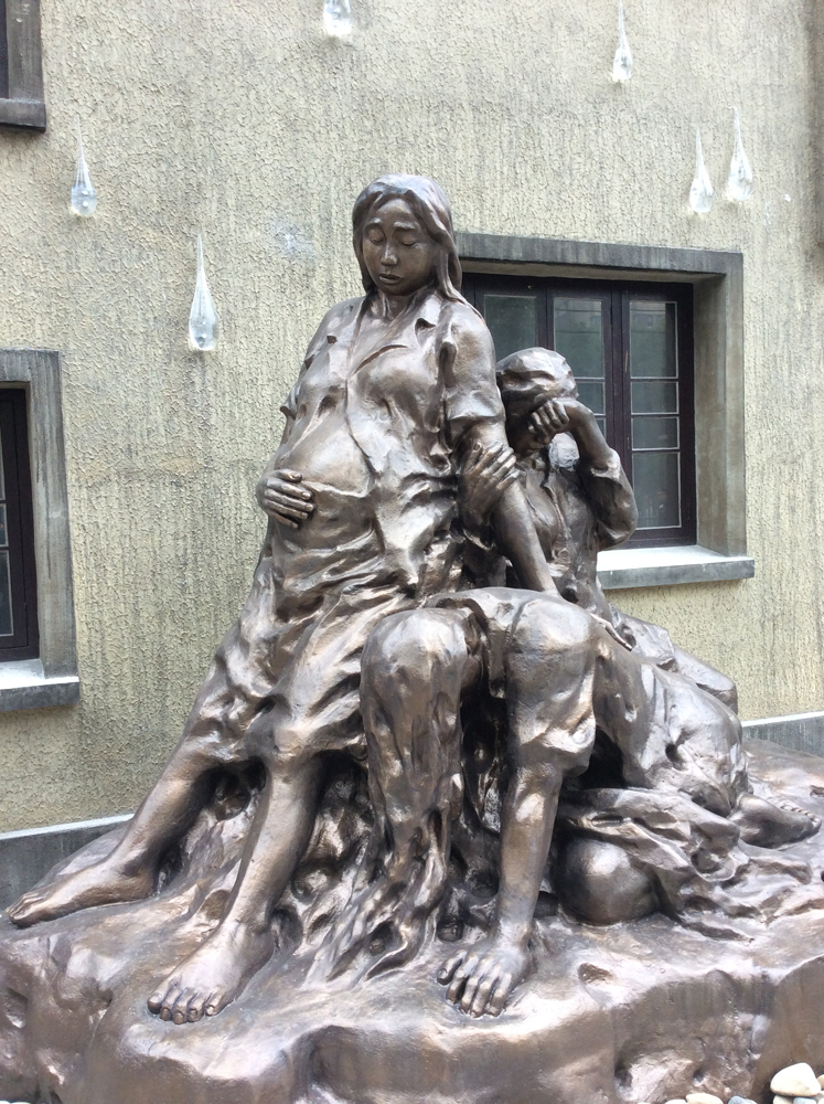 主題雕塑的身後,即陳列館的外牆上,十幾顆由鉑晶製成的巨大「淚滴」,寓意?「淚流一面牆」,碩大的淚滴,折射出當年「慰安婦」的無助與絕望。