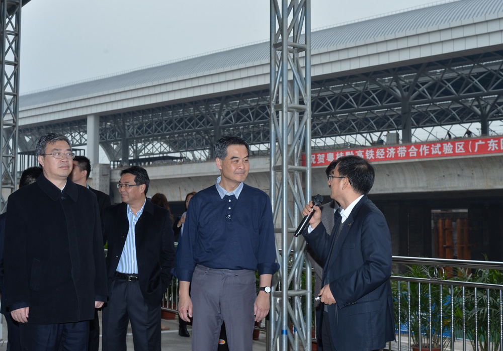 圖:梁振英(右二)在佛山市市長魯毅(左一)陪同下,考察佛山市南海區佛山西站,了解該區的鐵路及城市交通等發展