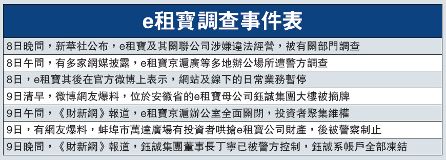 新華社周二晚間公布,e租寶網站以及關聯公司在開展互聯網金融業務中涉嫌違法經營活動,正接受有關部門調查。隨後,公安機關全面進駐鈺誠集團北京總部、金易融(北京)網絡科技有限公司進行封鎖,上海、安徽、廣東等地也開展了對e租寶的調查,其間警方帶走了公司部分員工。