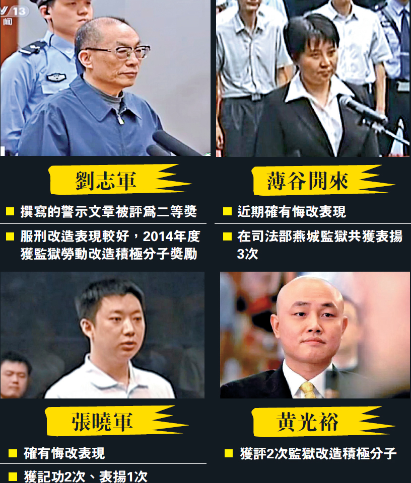 【大公報訊】前鐵道部長劉志軍、重慶市委前書記薄熙來的妻子薄谷開來獲得服刑監獄提出減刑建議,北京市高級法院分別裁定將劉志軍、薄谷開來死刑緩期二年執行的刑罰減為無期徒刑,原判附加刑不變。此外,薄谷開來案同犯張曉軍再獲減刑1年,國美創辦人兼大股東黃光裕獲建議減刑1年。