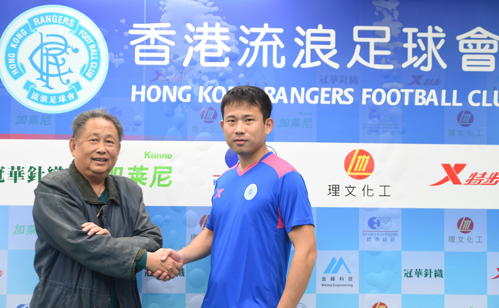 圖:流浪總監李輝立(左)與齊藤誠司握手,歡迎他加盟/大公報記者李恆基攝