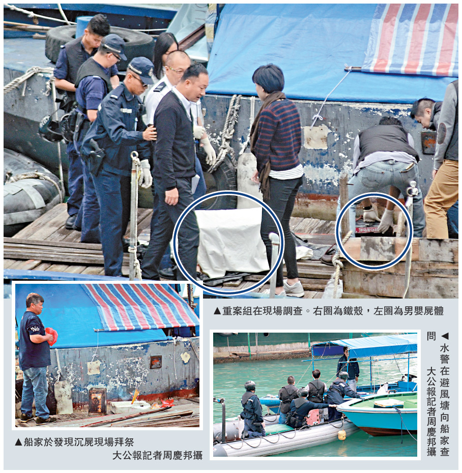 昨晨卻見該異物仍在水中飄浮,他好奇下俯身細看,竟見在異物下有一小手,懷疑是一個嬰兒,吳某大驚報警求助。警方接報與消防蛙人趕至現場,將嬰兒從水中撈起,經救護員檢驗證實該嬰兒已死去多時,身上被人綁了一個鐵殼,警方立即封鎖現場調查,水警人員乘坐小艇,向避風塘內的船家查問和調查,據現場消息稱警方查問日前有否目擊可疑男女,發現嬰屍的船隻。至下午嬰屍移送殮房後,探員將證物一併檢走後,避風塘始解封。