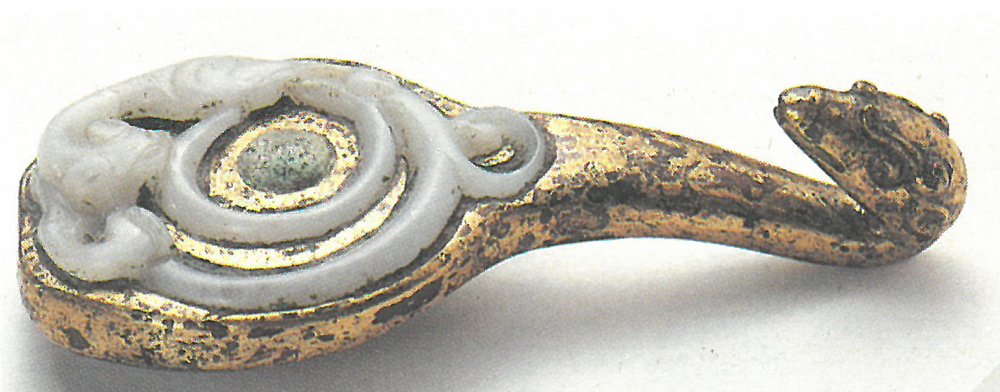附圖是漢代獨特的珍罕品,為鎏金龍首帶勾;中腹部分嵌白玉?龍,造型古拙,別出心裁。白玉與銅鎏金配合和諧,好比結成一體。銅鎏金部分雖然經久剝蝕,但不失雋美。