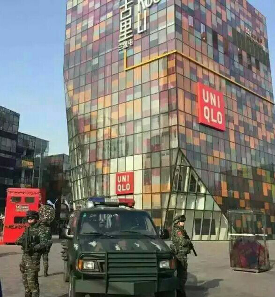 下午,三里屯使館區附近增加了「雪豹」突擊隊的悍馬特種車輛在執勤,旁邊還有持槍特警。現場執勤保安也較平時增多。有執勤保安稱,中午撤走了很多垃圾桶。至16時左右,三里屯酒吧街開始採取封路措施。