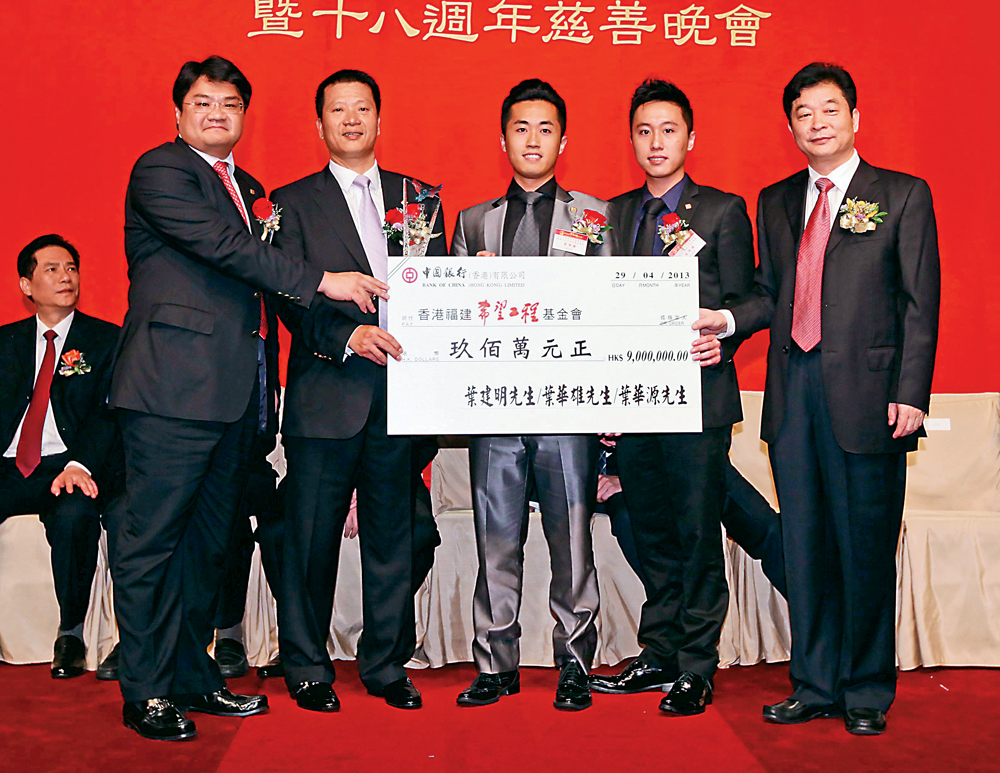 圖:葉建明(左二)、葉華雄(左三)、葉華源(右二)父子捐款港幣900萬元