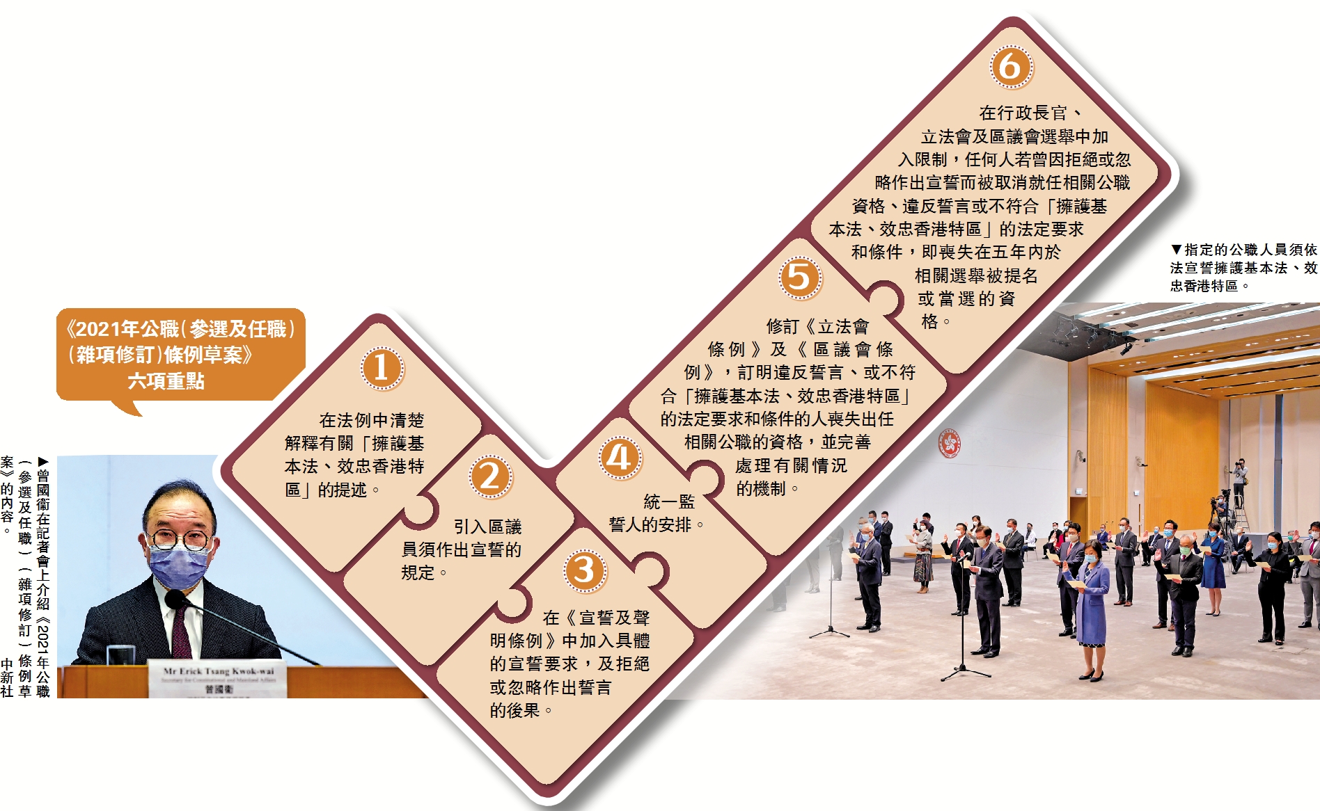 曾國衞昨日在記者會上介紹《2021年公職(參選及任職)(雜項修訂)條例草案》的內容。他表示,特區政府將向立法會提交文件,建議修訂《宣誓及聲明條例》《立法會條例》《區議會條例》等,除基本法第104條下包含的公職人員之外,區議員也須宣誓,強調效忠香港特區為區議員的基本責任。
