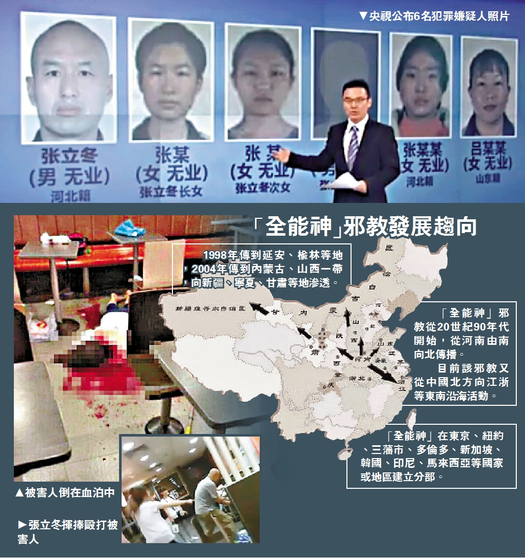 【大公報訊】據公安部治安管理局、公安部「打四黑除四害」專項行動辦公室官方微博31日消息,5月28日晚,在山東招遠市麥當勞快餐店內發生一起故意殺人案。案發後,招遠市公安局4分鐘內趕到現場,當場將6名犯罪嫌疑人全部抓獲。經了解,6名犯罪嫌疑人係邪教「全能神」組織成員。