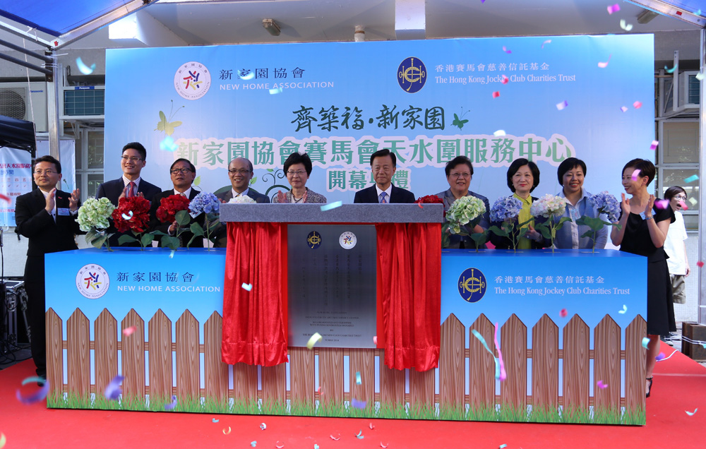 位於天水圍天耀?耀盛樓地下的新家園協會賽馬會天水圍服務中心昨日正式開幕,政務司司長林鄭月娥、香港賽馬會董事范徐麗泰、中聯辦社工部部長楊茂、立法會議員葉劉淑儀、梁志祥、麥美娟,以及港區全國人大代表陳勇等人,在新家園協會董事會會長許榮茂陪同下主禮。