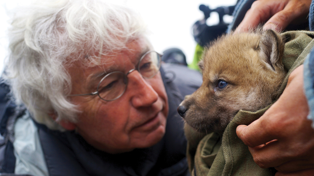 圖:導演阿諾在片場與狼崽「互動」