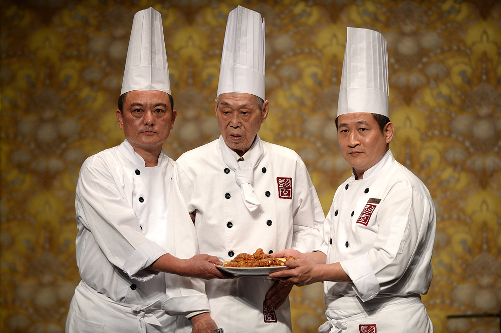 圖:96歲高齡的彭長貴(中)上周向來賓展示他製作的「左宗棠雞」\新華社