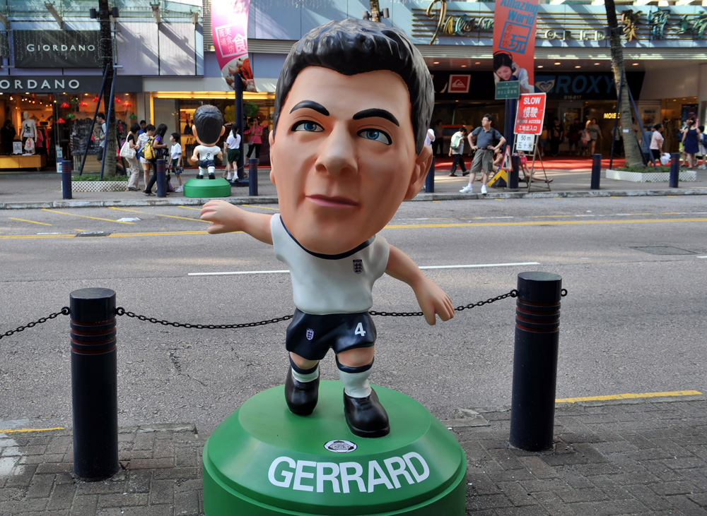 圖:分析認為,未必世界杯期間股市會例淡。世界杯卡通足球員雕塑近期在香港展出,圖為英格蘭隊球員傑拉德的卡通雕塑\新華社