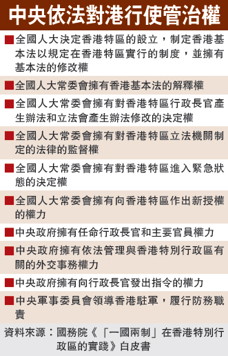 白皮書強調,中央依法履行憲法和香港基本法賦予的全面管治權和憲制責任,有效管治香港特區,包括:組建香港特區政權機關、支持指導香港特區行政長官和政府依法施政、負責管理與香港特區有關的外交事務、負責管理香港特區的防務、行使憲法和香港基本法賦予全國人大常委會的職權。