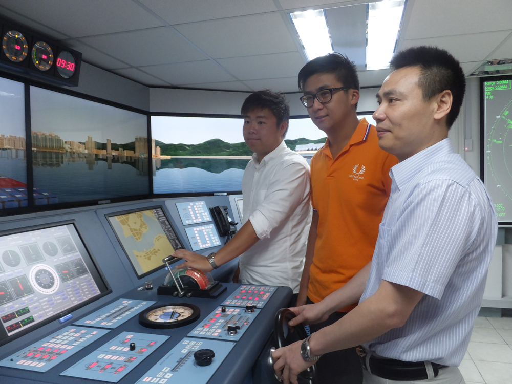 圖:楊開強(右一)表示,航海模擬器會提供船隻在各種故障及危急情況下的操作處理訓練/本報記者林丹媛攝