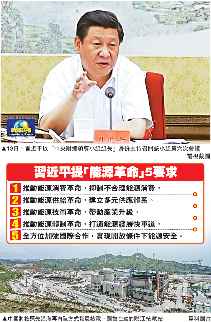 【大公報訊】國家主席習近平13日主持召開中央財經領導小組第六次會議,研究中國能源安全戰略。習近平強調,面對能源供需格局新變化,必須推動能源生產和消費革命。在確保安全前提下,抓緊啟動東部沿海地區新的核電項目建設,加大中亞、中東、美洲、非洲等油氣合作力度,推進能源體制改革。