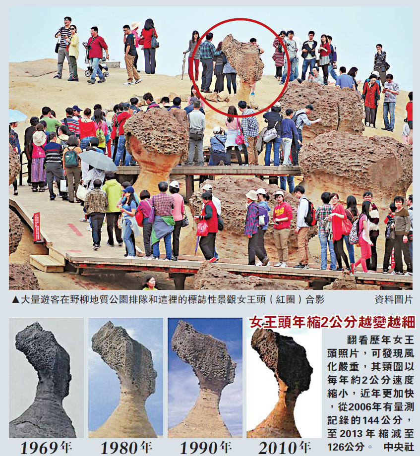 圖:大量遊客在野柳地質公園排隊和這裡的標誌性景觀女王頭(紅圈)合影/資料圖片