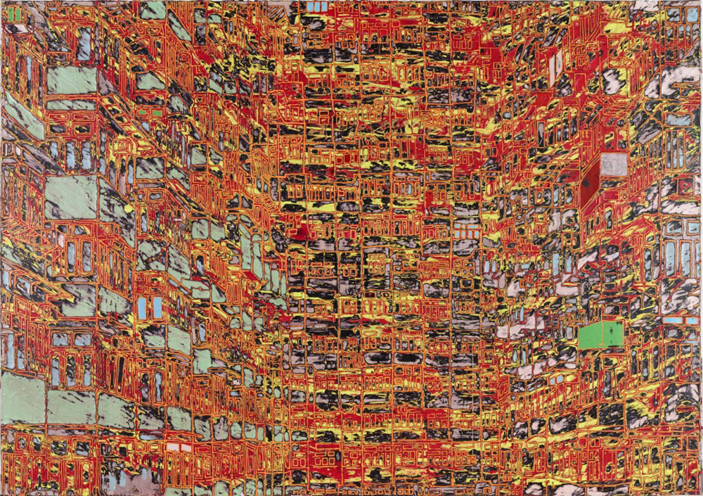 《南景》與《西景》都是由二個部分組成的作品。一幅幅被抽象化和細分化的房屋斷面,分別以畫框裝裱起來,堆疊成一幅網格狀、由個別斗室組成的正面透視圖。畫面上的綠色和藍色塊面,被相交的鮮黃及銹紅線條貫穿,呈現出變化萬千的奇特觀點,共同構建成一個和諧卻又流動的構圖。