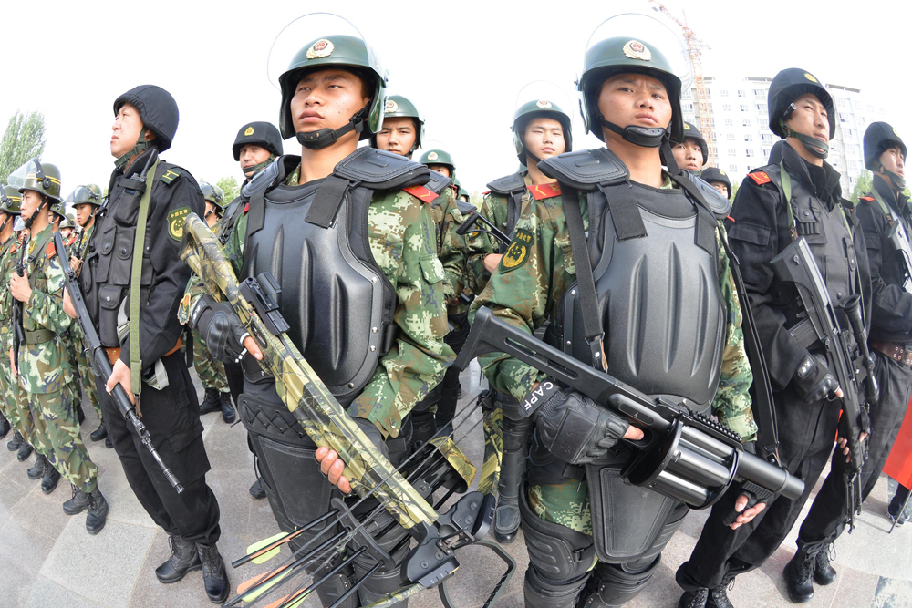圖:自5月23日開展嚴打暴恐專項行動一個月來,新疆公安機關共抓獲380餘名嫌犯。圖為阿瓦提縣舉行誓師大會\中新社