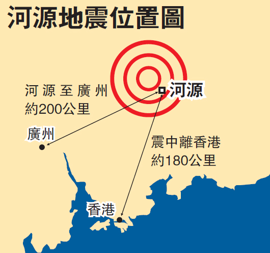 另外,香港天文台表示,廣東省河源地震震中位於香港之北約180公里。截至下午2時18分,天文台接獲超過10名市民報告,表示感到輕微震動,震動維持數秒,本港的地震烈度為修訂麥加利地震烈度表的第三度,即室內有感,類似小型貨車駛過的震動。