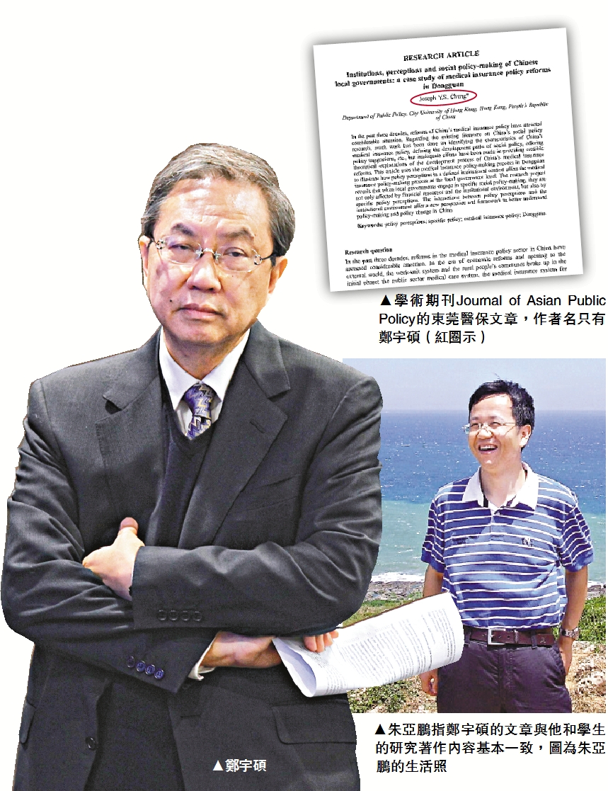 □城市大學政治學系講座教授鄭宇碩被投訴學術失德風波有突破性發展。疑遭剽竊學術著作的中山大學朱亞鵬教授接受本報查詢時表示,他於2013年發給鄭宇碩的文章是由他與學生聯合研究成果,鄭宇碩完全未有參與,對於文章被翻譯成英文及以鄭宇碩名義出版,他全不知情。對於鄭聲稱其英文文章是參考了朱亞鵬、岳經綸等內地學者著作,「拼湊為自己的文章」的說法,朱亞鵬直斥其非,指出鄭宇碩所說的多名作者合著的文章,與其英文論文內容「截然不同」,卻與朱和學生合作的文章內容「基本一致」,間接證實鄭有抄襲之嫌。/大公報記者劉?裕 圖文