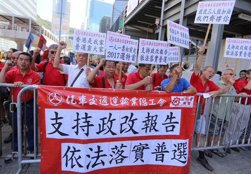 圖:各界歡迎政府昨公布政改諮詢報告及特首報告,圖為工聯會屬會汽車交通運輸業總工會在立法會外集會支持報告/本報記者何嘉駿攝