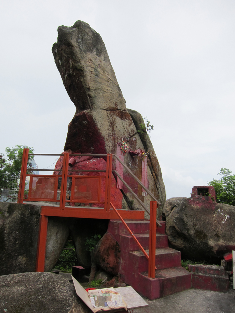「姻緣石」位於寶雲道健步行徑的中段,經過寶雲道公園再向東行大約10-15分鐘,右側會有一道樓梯,旁邊的大石上亦寫有「往姻緣石」字樣。沿樓梯拾級而上,會先來到一個香燭台,這裡會有人告訴你應該怎樣參拜。看那燭台上面的石頭都被熏得黑黑,就可聯想到多年來的香火有多鼎盛!再沿樓梯繼續向高處進發,盡頭就是如大炮一樣聳立的「姻緣石」!