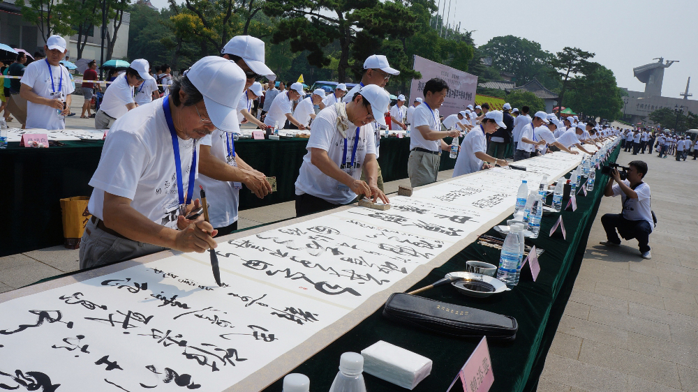 圖:海峽兩岸120位書法家共同創作120米長卷,紀念甲午戰爭爆發120周年。/大公報實習記者孫琳攝