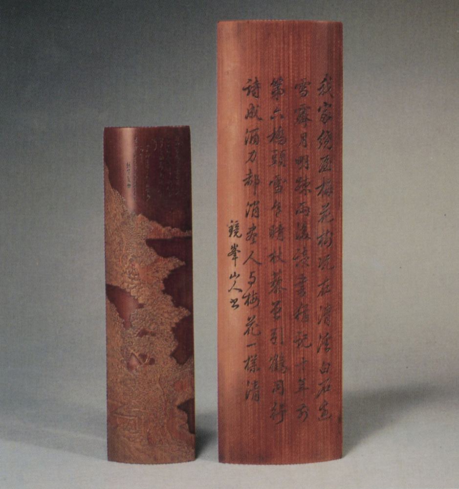 附圖為一位收藏家所珍藏的兩件竹刻作品,均為清代中期雕製,分別是刻上鏡?山人題字的臂擱(秘閣),以及「留青」山水的腕擱(腕鎮);可說代表明、清時期兩種具代表性的竹刻風格。