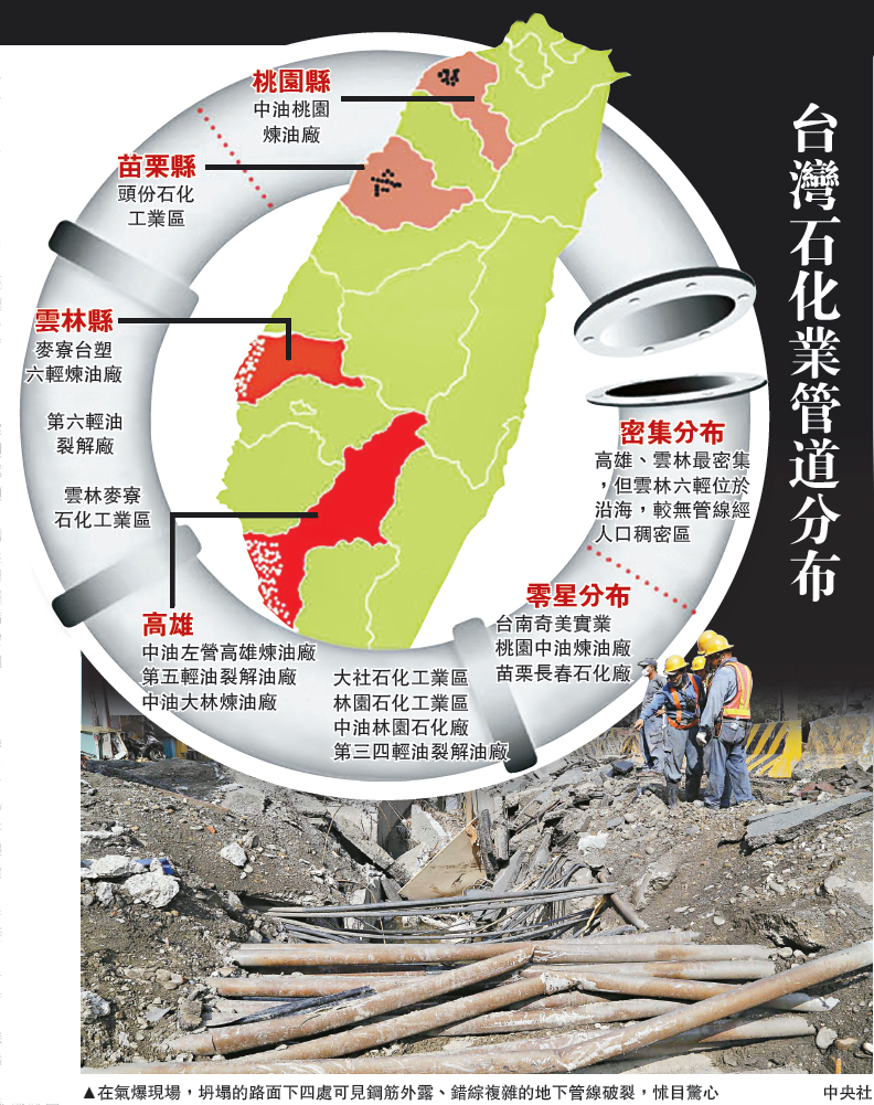 根據經濟部與「中油」初步掌握的資料,至少有16條石化重要幹線貫穿整個高雄市中心,產權卻分屬5家石化集團:中油管線有7根,中石化和榮化都有1條管線,亞聚4條管線,台塑也有3條八吋管,榮化管線綿延23.2公里。上月高雄捷運局還不小心挖破中油「苯液管」,差點釀成大禍,因為苯比丙烯毒萬倍以上,是高度致癌物,在常溫下易燃,可能造成驚天爆。
