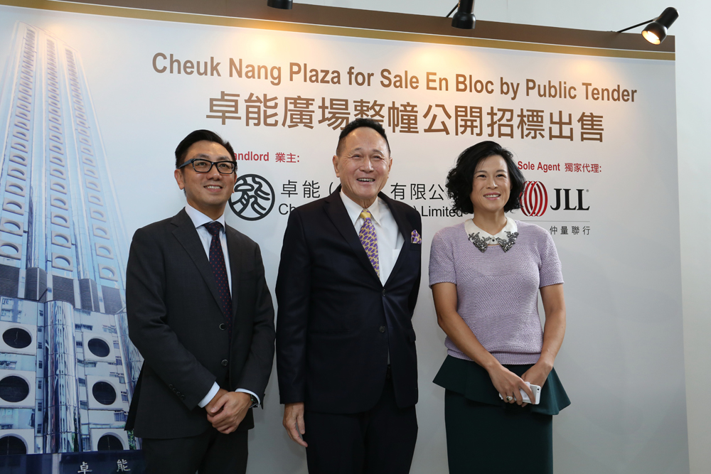 圖:卓能廣場整幢公開招標出售,左起:仲量聯行香港資本市場部區域董事陳柱衡、趙世曾、趙式芝 /大公報記者 何嘉駿攝