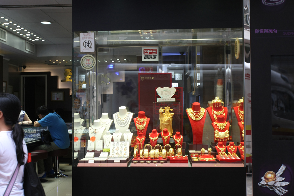 圖:珠寶店櫥窗內(藍圈位置),一盤金鏈被賊人搶走/本報記者周慶邦攝