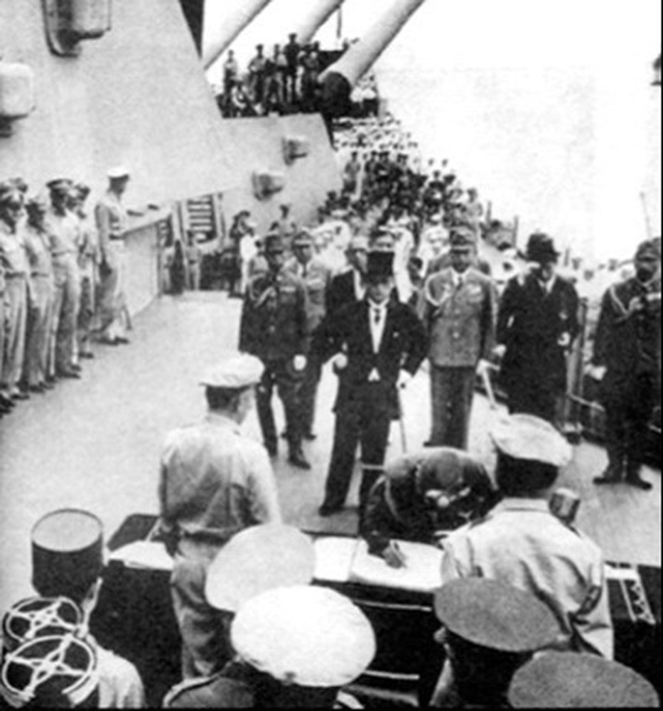 圖:「密蘇里」號戰艦上的日本投降簽字儀式,大公報記者黎秀石攝於1945年9月2日