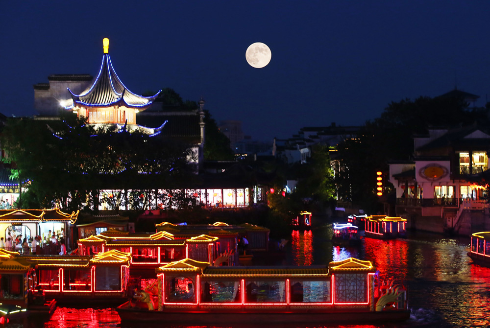 9月6日,央電「2014最美賞月地」徵集活動網絡投票結束,十大最美賞月地出爐,南京夫子廟秦淮河畔、無錫太湖黿頭渚、西安大雁塔、桂林象鼻山、揚州瘦西湖、敦煌月牙泉等十個景點勝出。「最美賞月地」徵集活動自8月中旬啟動,近30萬名網友通過網絡進行了投票。圖為去年中秋之夜,南京夫子廟秦淮河上空明月當空。 (中新社)