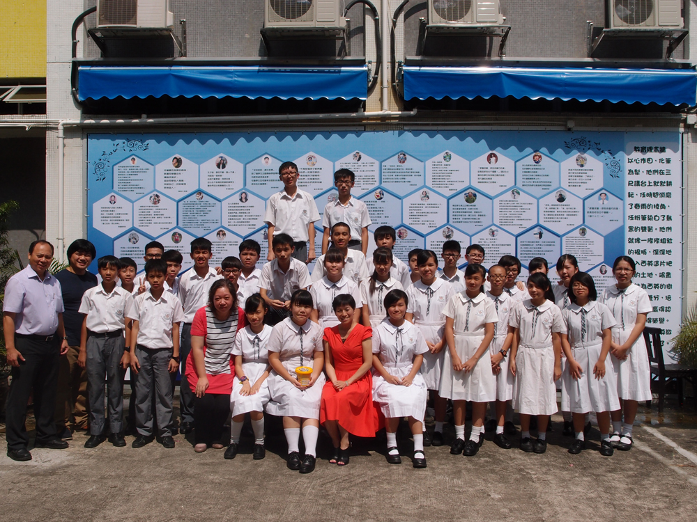 圖:簡加言(前排中)與師生們在教育理念牆留影