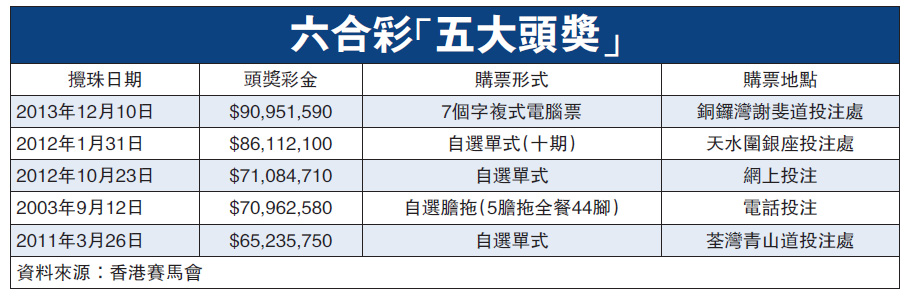 不同顧客有不同的「心水」購票方式,根據六合彩五大頭獎資料,最幸運的投注者是親身前往銅鑼灣謝斐道投注處,以7個號碼複式電腦票,一注獨中超過9000萬獎金。另外3個大獎得主皆採用「自選單式」購票,分別獲得6524萬元、7108萬元、8611萬元。另外1個幸運兒則是用電話投注,購買「自選膽拖,5膽拖全餐」,抱回7096萬元獎金。