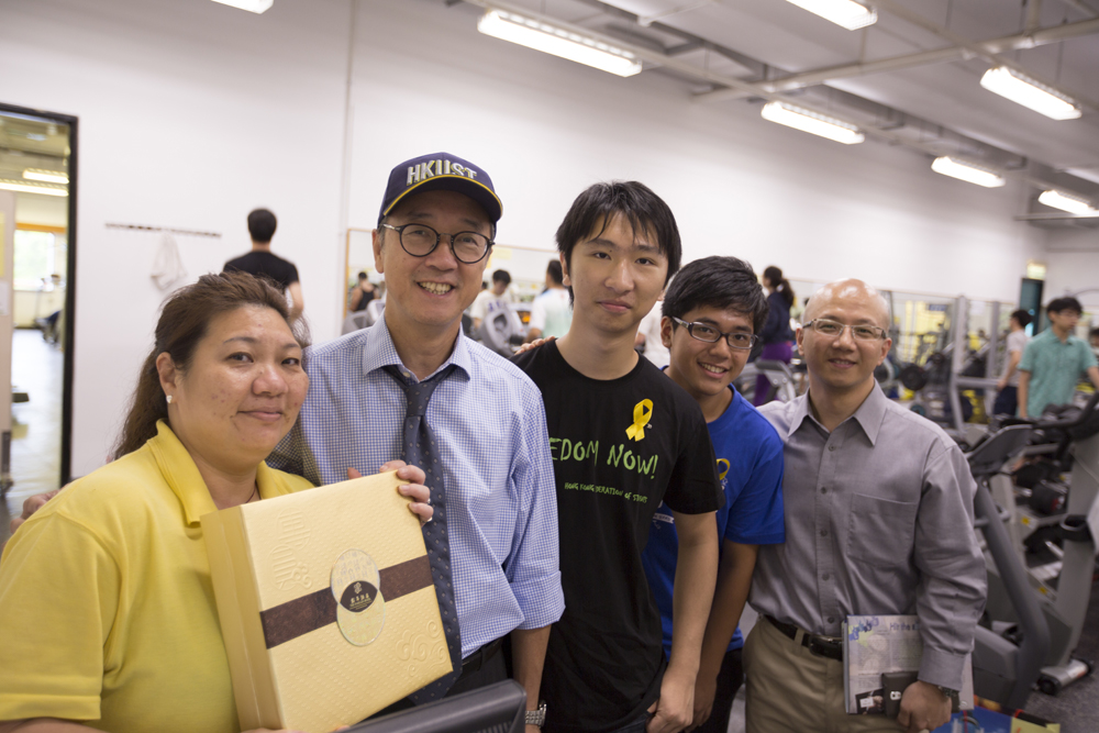 科大校長陳繁昌(左二)與科大學生會主席羅緯綸(左三)日前向前線員工派發月餅,祝願大家「人月兩團圓」