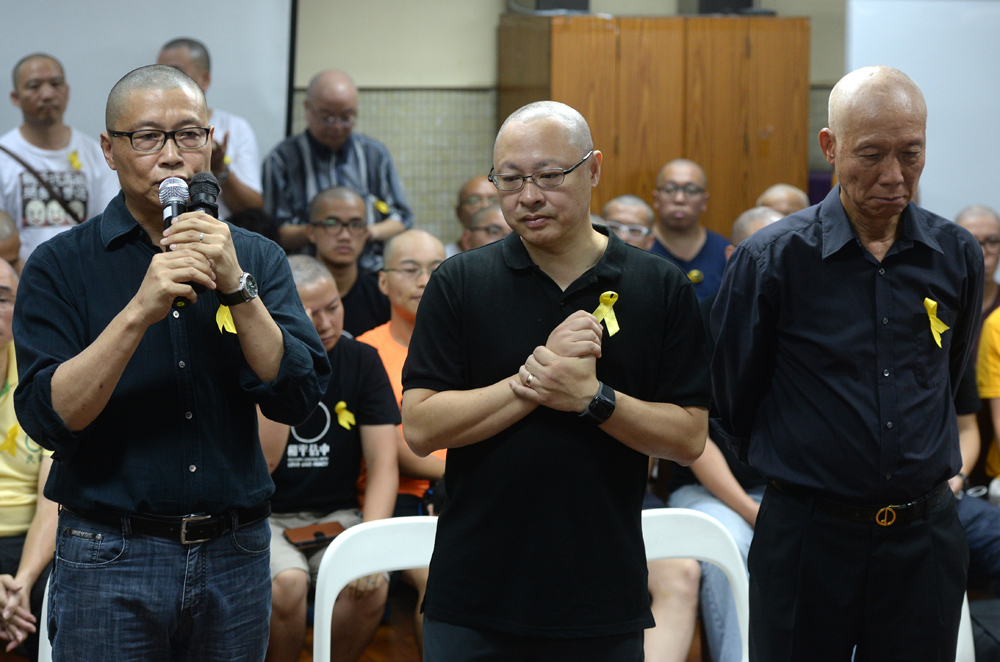 「佔中三丑」戴耀廷、陳健民和朱耀明昨日搞了一場所謂「光明頂」剃頭明志鬧劇,有43名支持者參與,包括前民主黨主席楊森、浸會大學社工系講師邵家臻、前立法會議員陳淑莊等。他們身穿黑衣,繫上黃絲帶,現場有人以樂器伴奏。戴耀廷剃頭前聲稱,剃頭具有兩重意義,包括代表剃無可剃,無機會妥協,以及展示爭取民主的決心云云。