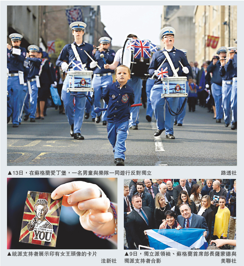 【大公報訊】綜合美聯社、中央社、英國《每日郵報》13日報道:蘇格蘭將於本月18日舉行公投決定去留,上萬名統派支持者13日走上愛丁堡街頭,為反對蘇格蘭獨立發聲。與此同時,在各大銀行及財團大打經濟牌,紛紛警告獨立將造成嚴重後果之際,蘇格蘭獨派人士威脅,若獨立成功,將對親英統派企業「秋後算帳」,包括國有化英國石油公司(BP)等。