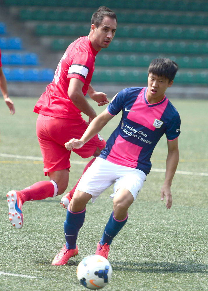 圖:港足的聶凌峰(左)與傑志球員葉偉超鬥法/本報攝