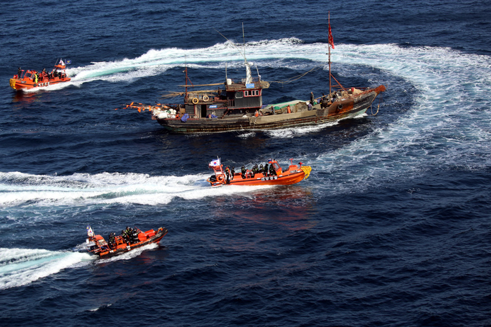 圖:10月8日,韓國海警船在黃海包圍一艘涉嫌「非法」捕魚的中國漁船\韓聯社