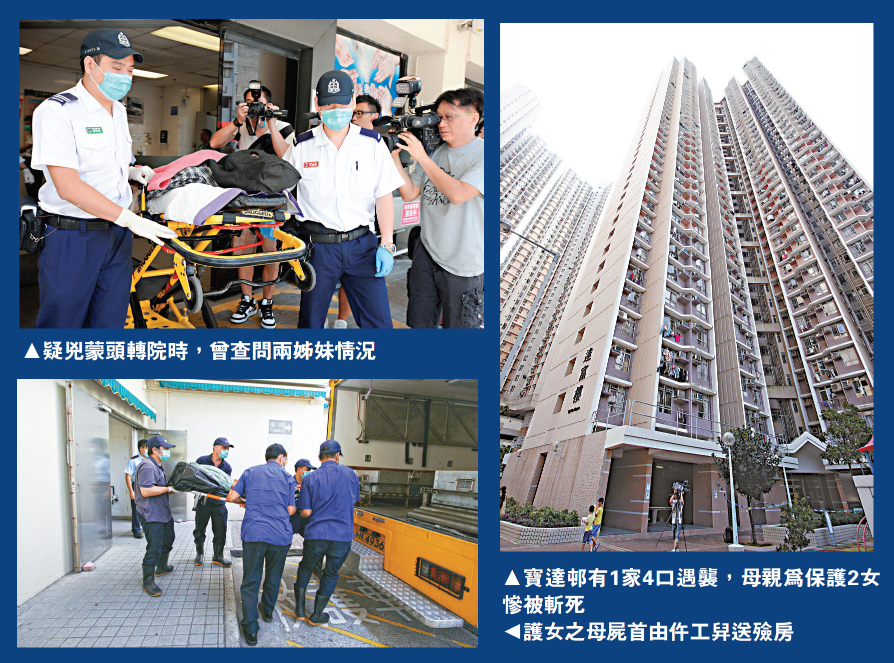 【大公報訊】秀茂坪寶達?發生恐怖命案,1名七旬老翁突然失常,無故在走廊潑淋易燃液體襲擊鄰居一家四口,繼而揮刀追斬三母女,衝入升降機當?幼小面前,斬死以血肉之軀保護愛女的母親。疑人犯案後折返寓所,引火企圖自焚,被破門而入的警員及消防員制服落網。警方證實疑人有精神病紀錄,行兇動機仍在調查,;可憐兩小姊妹,因橫禍家破人亡,目睹母親慘死亂刀之下。