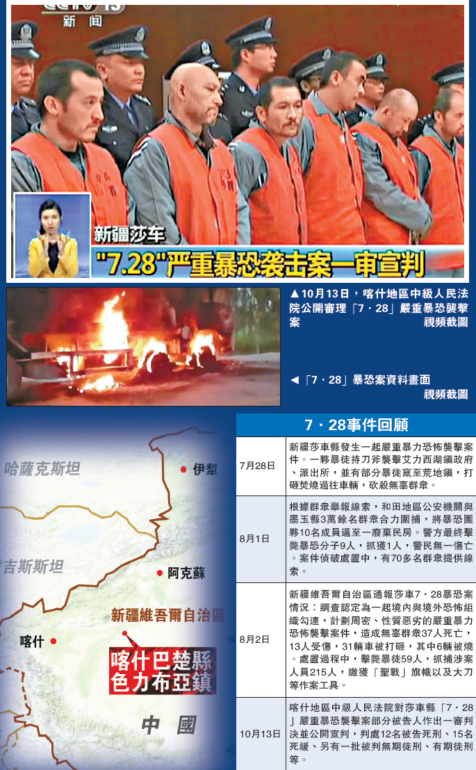 【大公報訊】據中新社消息:10月13日,喀什地區中級人民法院對莎車縣「7.28」嚴重暴恐襲擊案部分被告人作出一審判決並公開宣判,以組織領導參加恐怖組織罪、故意殺人罪、非法製造爆炸物罪、放火罪、綁架罪、以危險方法危害公共安全罪分別判處12名被告死刑、15名死緩、另有一批被判無期徒刑、有期徒刑等。庭審現場有各族群眾和被告人親屬參與旁聽,法庭使用被告人本民族語言文字進行訴訟。