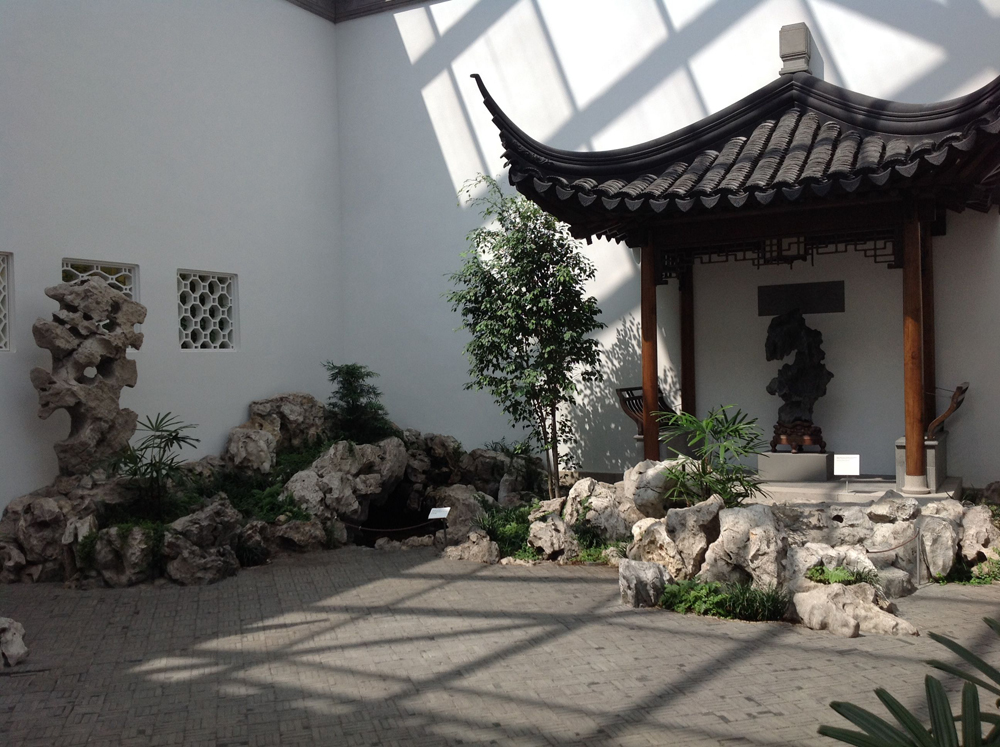 明軒院中供觀賞之石景有三處:一處南牆的玲瓏石;一處是冷泉亭北側的「三峰」;另一處是曲廊東側小空間中的「石筍」。這些太湖石也來之不易。施工隊在蘇州地區好不容易收了一百多噸很珍貴的老石頭。張慰人說:「僅此一回。以後所有的出國去的太湖石,我們堅決沒有再從蘇州搬老的石頭出去。」