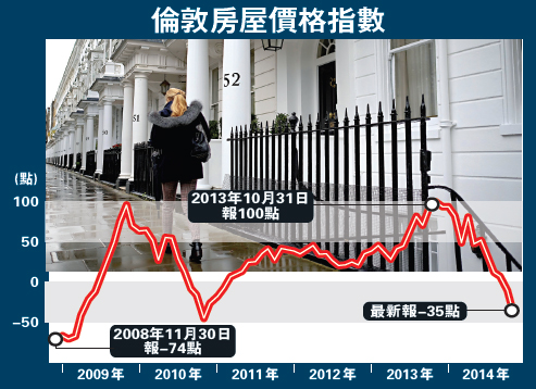 倫敦物業市場出現冷卻,英國皇家特許測量師學會(RICS)表示,該會的一項反映倫敦房屋價格指數,10月份跌至-35,創2010年10月以來最低,相對9月份的-9讀數大幅下滑。而反映英國全國房屋價格指數亦由30跌至20,創去年5月以來最低讀數。RICS首席經濟分析員表示,樓市走勢部分反映出潛在買家對於置業態度的審慎,隨?房價下滑,對需求造成一定影響。