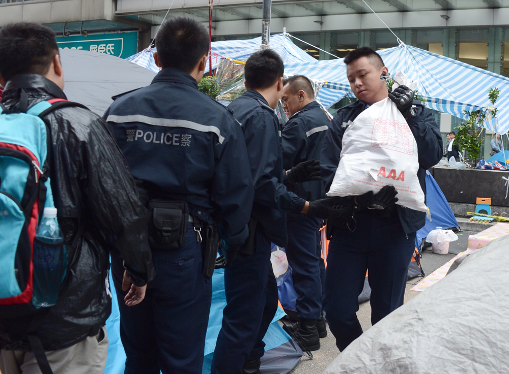 圖:警員在旺角佔領區檢走十多袋建築廢料,內藏石頭、石屎及磚瓦