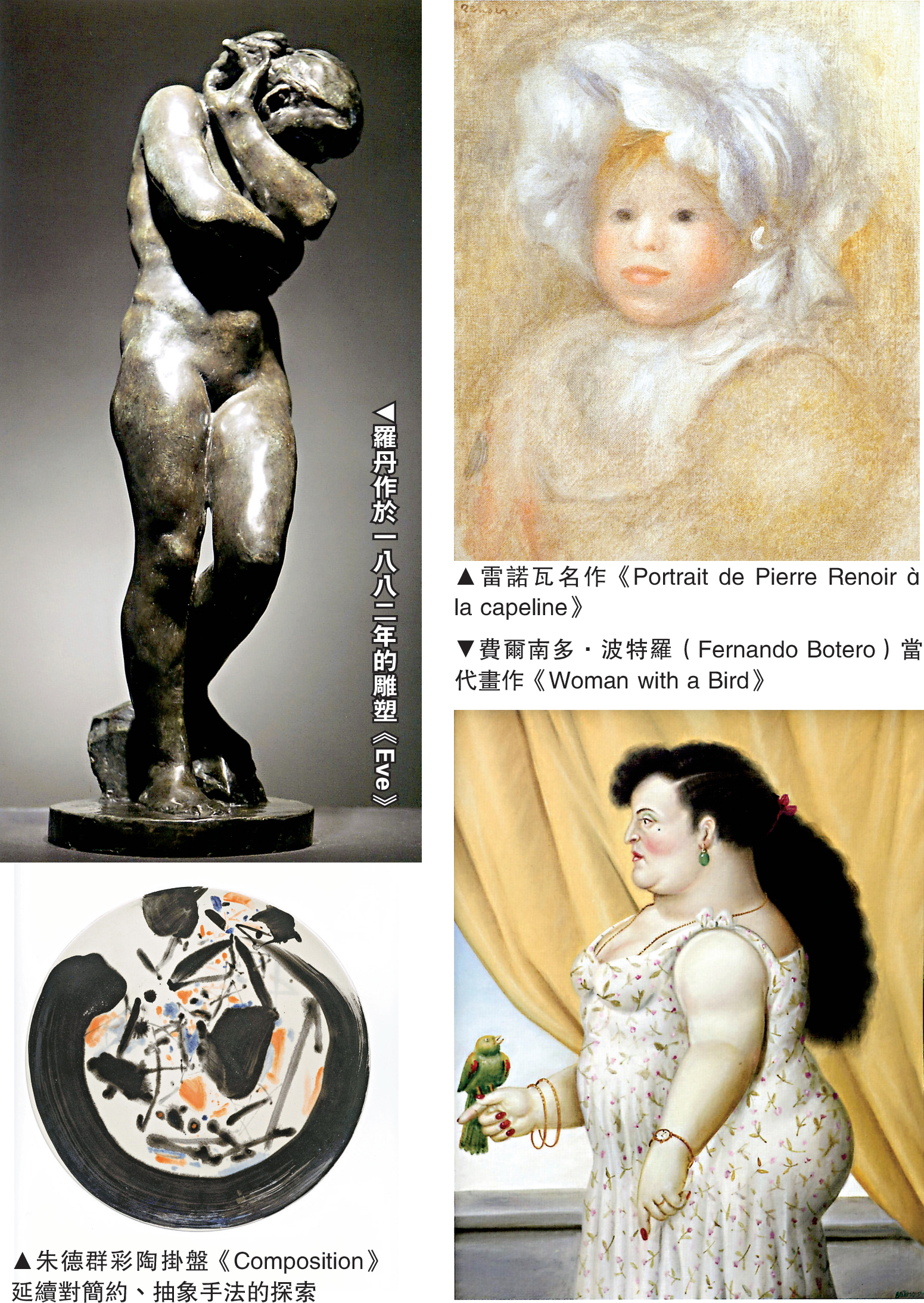 作為展覽重點,雷諾瓦的四幅畫作環繞?羅丹的雕塑依此排列,皆出自畫家十九世紀末、二十世紀初的作品,描繪了巴黎城市風景、人像及田園野趣。雷諾瓦以人物畫出名,其間又多強調甜美、悠然的氣氛,《Portrait de Pierre Renoir a la capeline》便為代表。畫中人物面頰飽滿,在雷諾瓦慣用的明亮且飽和度高的光線下顯得溫暖,符合畫家以繪畫為觀者帶來愉悅的初衷。
