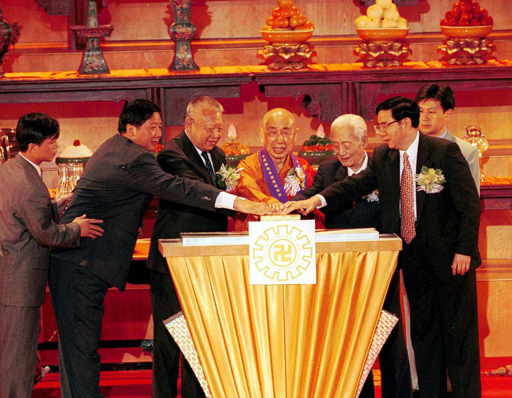 圖:1999年佛誕日佛教界迎請佛牙舍利蒞港瞻禮祈福大會。圖為董建華與其他主禮嘉賓一同主持按鈕開幕儀式