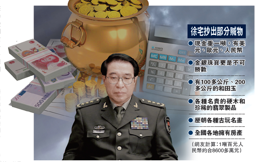 【大公報訊】《鳳凰周刊》20日發表封面調查文章《國賊徐才厚查抄內幕》,披露原中央政治局委員、軍委副主席徐才厚腐敗案的偵辦過程,證實徐才厚因谷俊山貪腐案牽出的傳言,並披露了徐才厚部分貪腐財產的查抄細節,包括在北京阜成路一處2000平米豪宅的地下室,發現1噸多重的現金,查抄的財物堆積如山,辦案人員臨時叫來十幾輛軍用卡車才將其全部運走。