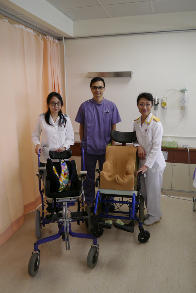 圖:威爾斯親王醫院的坐姿綜合診所提供多項專業的坐姿及特製輪椅服務:左起陳頌文、劉康然及李沈麗芳 本報記者 唐曉明攝