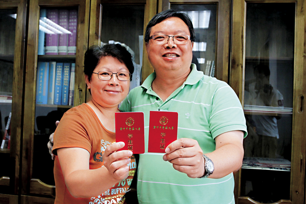 圖:港人黎釗洪夫婦展示他們的學生證」大公報攝